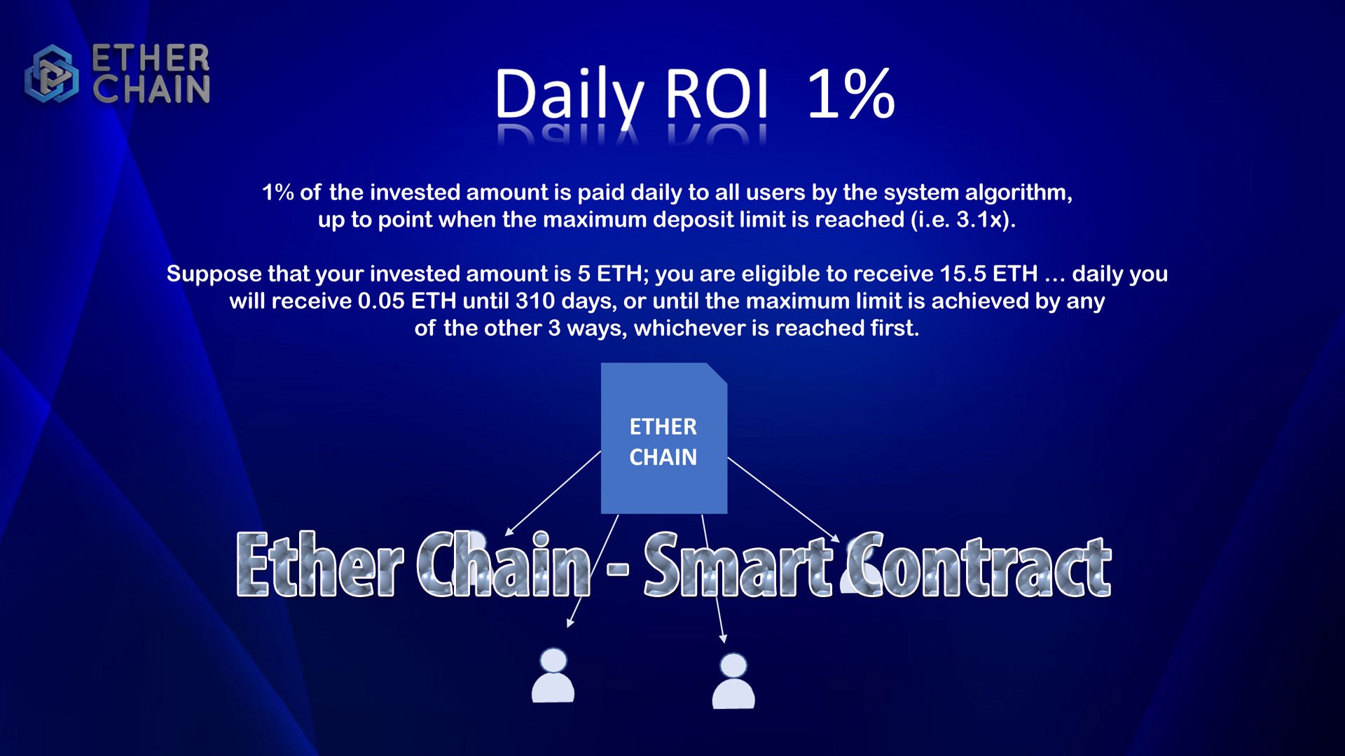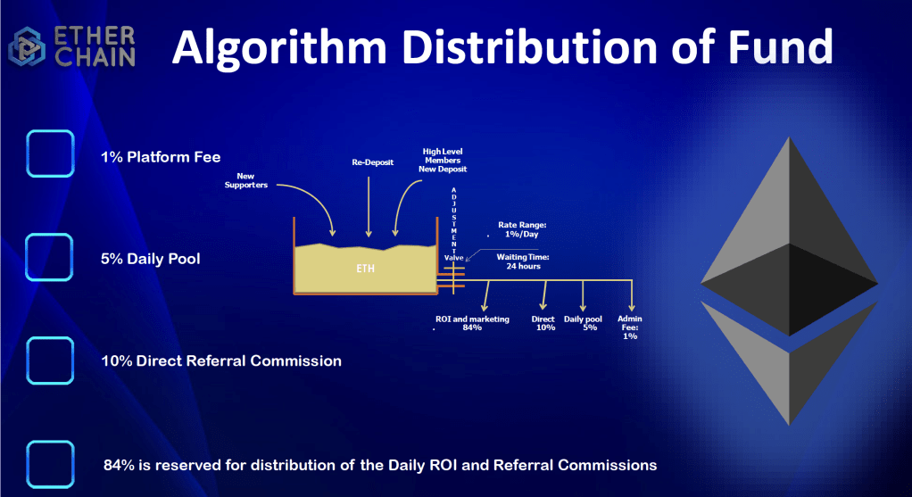 A napi 1%-ot, az okos-szerzodes algoritmusa a felhasznalok altal letetbe helyezett kozos penzalapbol biztositja minden EtherChain tagnak.
