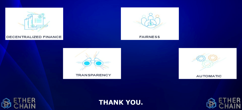 Az EtherChain 100% -ban decentralizált és közösségi alapú projekt; Ez azt jelenti, hogy a rendszerben nem garantálnak semmiféle további nyereséget, az EtherChain-tól csak a saját és a közösség erőfeszítésein alapszik, mivel ez egy P2P támogatási modell, amely a mindenki egyert es egy mindenkiert elmeleten alapszik.